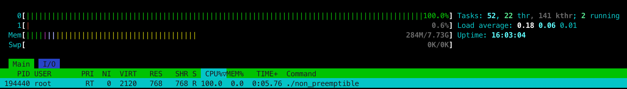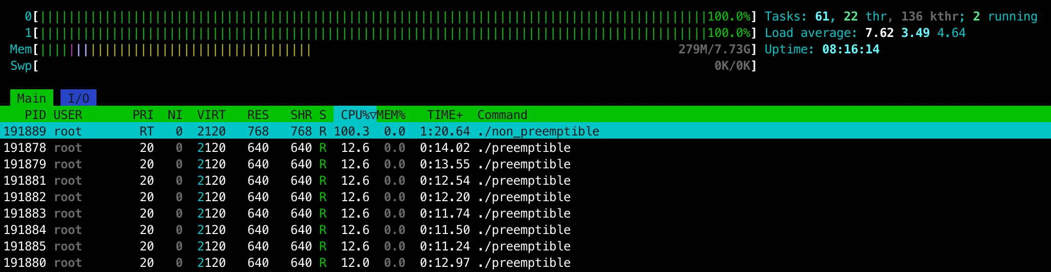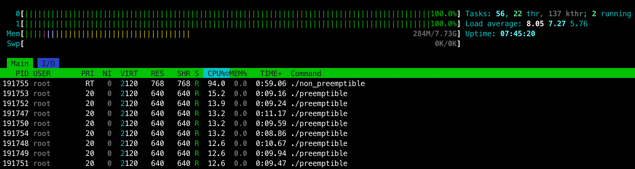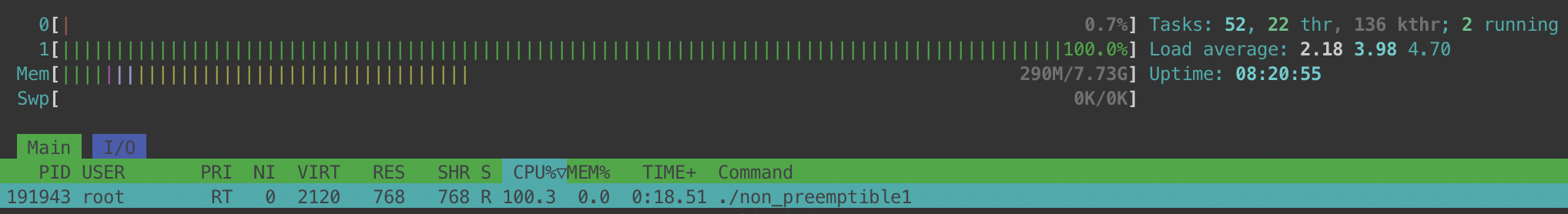 A SCHED_FIFO thread runs until either it is blocked by an I/O request, it is preempted by a higher priority thread, or it calls sched_yield(2).Running non_preemptible alongside 8 instances of preemptible I see the following in htop: