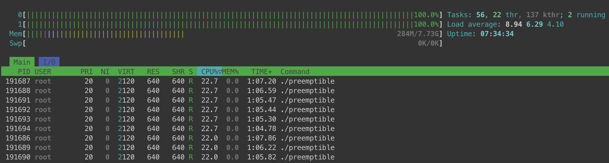 Immediately we see that non_preemptible hogs 94% of the CPU time and, while the preemptible instances have spent ~10 secs each on CPU, non_preemptible has spent 1 whole minute (as a result it also finished a lot earlier too).